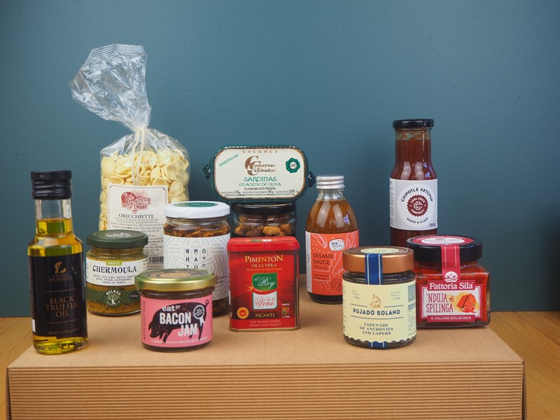 This hamper includes; Black truffle oil, Chermoula paste, Orecchiette pasta, Bacon jam, Cashew Crunch sauce, Chipotle nuts, Sardines, Paprika, Sesame sauce, tapenade, Chipotle sauce and Nduja.