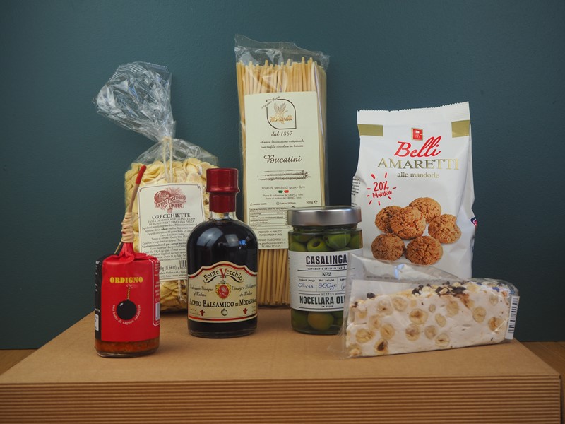 This hamper includes; Orecchiette pasta, Spicy sauce, Balsamic vinegar, Bucatini pasta, Olives, Amaretti biscuits and nougat.