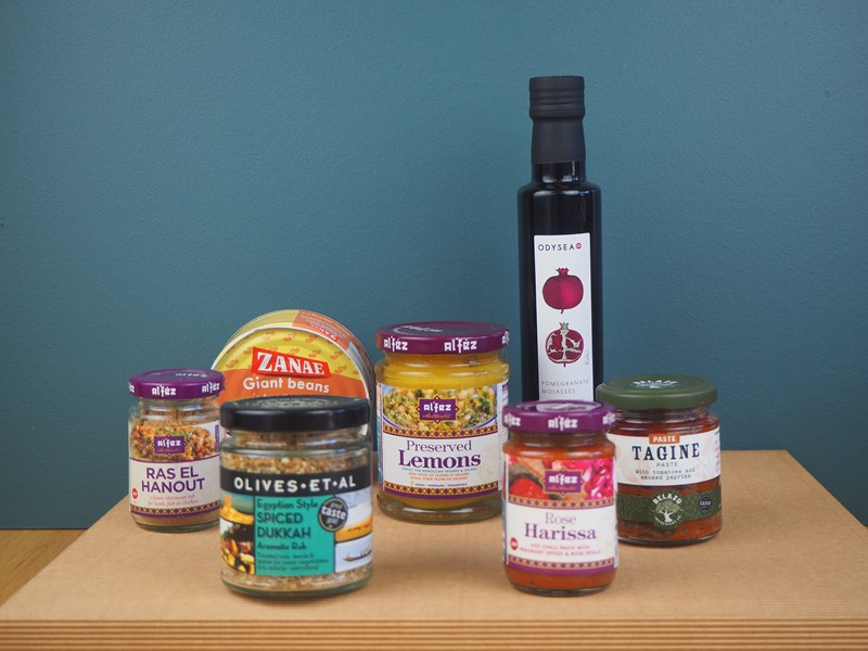 This hamper includes; Preserved lemons, pomegranate molasses, giant beans in tomato sauce, Tagine paste, Spiced dukkah, Rose Harrissa and Ras El Hanout.