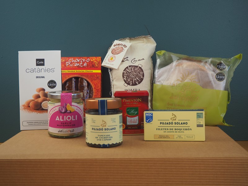 This hamper includes; Spicy chorizo, Bomba rice, Alioli, Tapenade, Paprika, Olive oil biscuits [Tortas], Caramelised almonds covered in praline and boquerones.