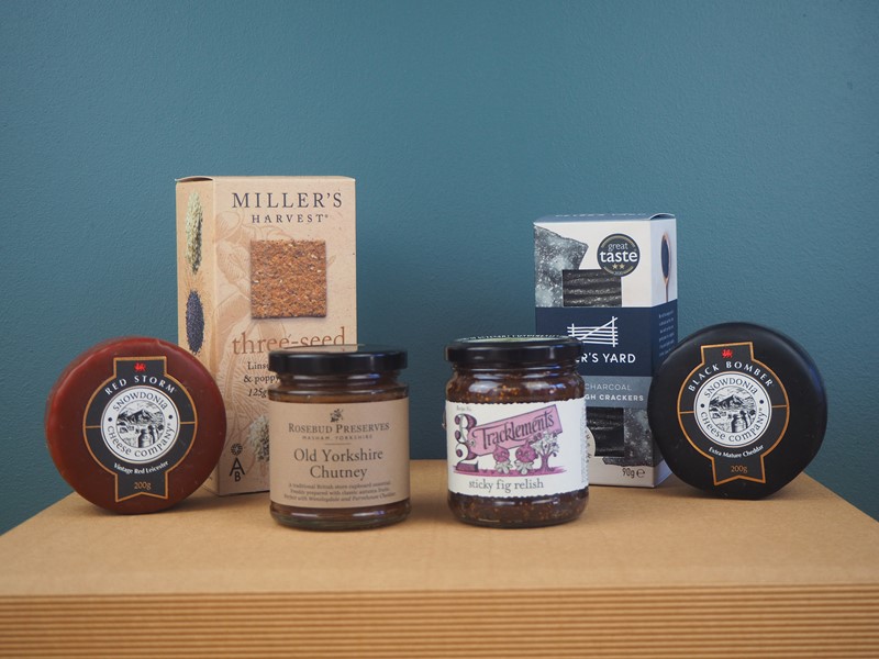 This hamper includes; Black Bomber mature cheddar, Snowdonia red storm cheese, Yorkshire Chutney, Sticky fig relish, Peter’s yard crackers and Millers crackers.